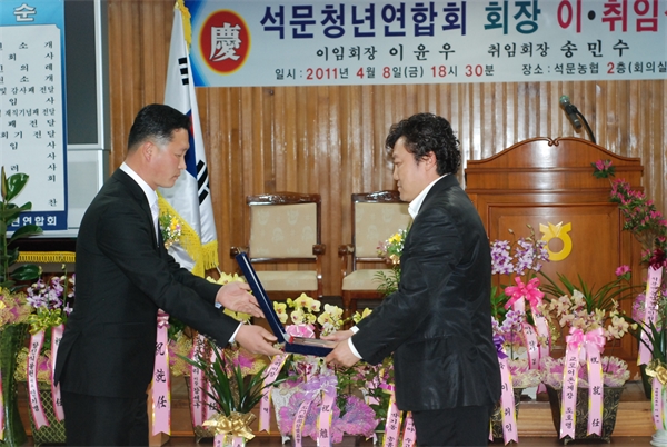 ¼®¹®Ã»³â¿¬ÇÕȸ ÃÑȸ ¹× ȸÀå ÃëÀÓ½ÄÀÌ Áö³ 8ÀÏ ¼®¹®³óÇù ȸÀǽǿ¡¼ ¿¸° °¡¿îµ¥ ¼Û¹Î¼ö ¾¾°¡ ȸÀå¿¡ ÃëÀÓÇß´Ù.