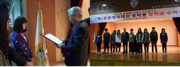 Á¶ÁØÀåÇÐÀç´ÜÀº ¸éõÁßÇб³ Á¦ 12ȸ Á¹¾÷»ýÀÎ Á¶¼º´Þ ¼±¹è°¡ ¾î·Á¿î ¿©°Ç ¼Ó¿¡¼µµ ²ÞÀ» ÀÒÁö ¾Ê°í ¿½ÉÈ÷ ¹è¿ì°íÀÚ ÇÏ´Â Çлýµé¿¡ ²ÞÀ» ÀÌ·ê ¼ö ÀÖµµ·Ï ±âȸ¸¦ ÁÖ°íÀÚ ¼³¸³ÇÏ¿© ¸Å³â Çлýµé¿¡°Ô ÀåÇбÝÀ» ¼ö¿©Çϰí ÀÖ´Ù.