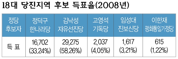 ±×¸®°í 4³â ÈÄ ±è³«¼º È帴 Áý±Ç´ç Èĺ¸¸é¼ Á¤ºÎ °æÁ¦°ü·á·Î ÃâÁßÇÑ °æÁ¦Â÷°ü Ãâ½Å Á¤´ö±¸ ¾¾¸¦ KO ½Ã۰í Àç¼±¿¡ ½±°Ô ¼º°øÇß´Ù. ÀÌ ºÎºÐÀÌ ¡®´çÁøÀÇ Á¤¼¡¯¸¦ ÀÍÈ÷ ¸»ÇØ ÁÖ´Â ºÎºÐÀ¸·Î À¯±ÇÀÚ ´ë´Ù¼öÀÇ º¸¼ö ¼ºÇâÀ» ¸»ÇØ ÁÖ°í ÀÖ´Ù.