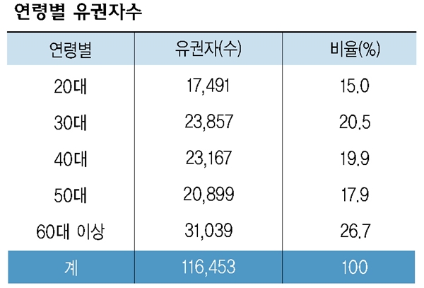 Ç¥¸¦ º¸¸é 60´ë ÀÌ»ó(3¸¸ 1039¸í) 26.7%>30´ë(2¸¸ 3857¸í)20.5%>40´ë(2¸¸ 3167¸í)19.9%>50´ë(2¸¸ 899¸í) 17.9%>20´ë(1¸¸ 7491¸í) 15% ¼øÀ¸·Î µå·¯³µ´Ù.