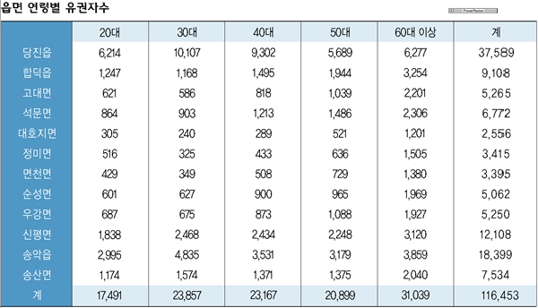 ÇÑ Á¤´ç¿¡¼ ÀÔ¼öÇÑ ÀڷḦ Åä´ë·Î º»´Ù¸é ´çÁøÀÇ <¿¬·Éº° À¯±ÇÀÚ¼ö>´Â ¸ðµÎ 11¸¸ 6453¸íÀ¸·Î Áý°èµÆ´Ù.