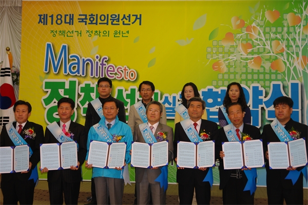 Èĺ¸ÀÚµéÀÇ Á¤Ã¥°ø¾à ´ë°áÀ» À¯µµÇϰí À¯±ÇÀÚµéÀÇ ¸Å´ÏÆä½ºÅä ÀÌÇØ¸¦ È®»ê½Ã۰íÀÚ ¼±°Å°ü¸®À§¿øÈ¸°¡ ¸¶·ÃÇÑ À̹ø Çù¾à½Ä¿¡¼ °¢ ¿¹ºñÈ帵éÀº Á¤Ã¥¼±°Å½Çõ Çù¾àÁõ¼¿¡ ¼¸íÇϰí ÀÌÀÇ Àû±ØÀûÀÎ ½ÇõÀ» ¼±¾ðÇß´Ù.