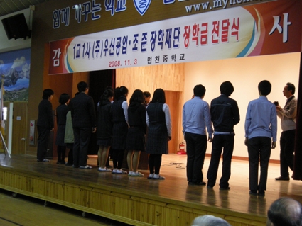 ÇлýÀÇ ³¯ÀÎ 3ÀÏ, ¸éõÁßÇб³(±³Àå ±è¼º»ï)¿¡¼­´Â Çູ¹è¿òÅÍ ¸¸µé±â Â÷¿ø¿¡¼­ ¡º1±³ 1»ç °á¿¬¡»À» ü°áÇÑ (ÁÖ)¿ì½Å°ø¾÷(´ëÇ¥ È«Á¤Çö) ÀåÇбݰú Á¶ÁØ ÀåÇÐÀç´Ü(ÀÌ»çÀå Á¶¼º´Þ) ÀåÇÐ±Ý Àü´Þ½ÄÀÌ °³ÃֵƴÙ.