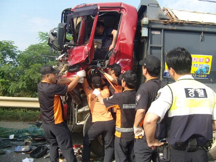 ¼Ò¹æ¼­ ¼®¹®119¾ÈÀü¼¾ÅÍ(¼¾ÅÍÀå ¹ÚŸ®) ±¸±Þ´ë¿ø µî 5¸íÀÌ »ç°íÇöÀå µµÂø ¶§ ´ýÇÁÆ®·°°ú ´çÁøÈ­·Â Åë±Ù¹ö½º°¡ Ãæµ¹ÇÑ »óȲ¿¡¼­, ÇöÀå¿¡´Â Æ®·°¿¡ ¿îÀüÀÚ°¡ ³¢¾î ÀÖ¾î ÀÚ·Â Å»ÃâÀÌ ºÒ°¡ÇÑ »óȲ-.